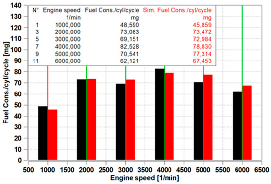 The fuel consumption trends across the operating points are illustrated in Figure 8. The maximum deviation between simulated and measured fuel consumption is 9.599%, while the minimum is 0.532%. The average deviation across all operating points is 5.730%, reflecting a moderate level of agreement between simulation and experimental results.