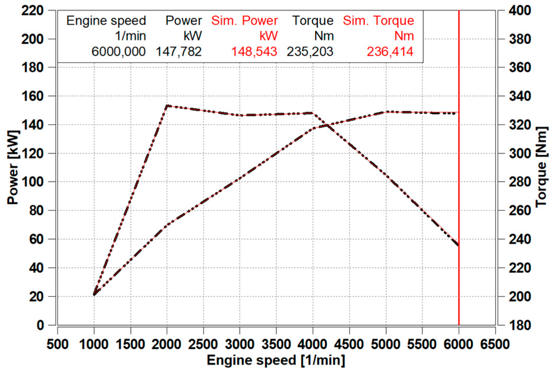 The measured and simulated engine power values are presented in