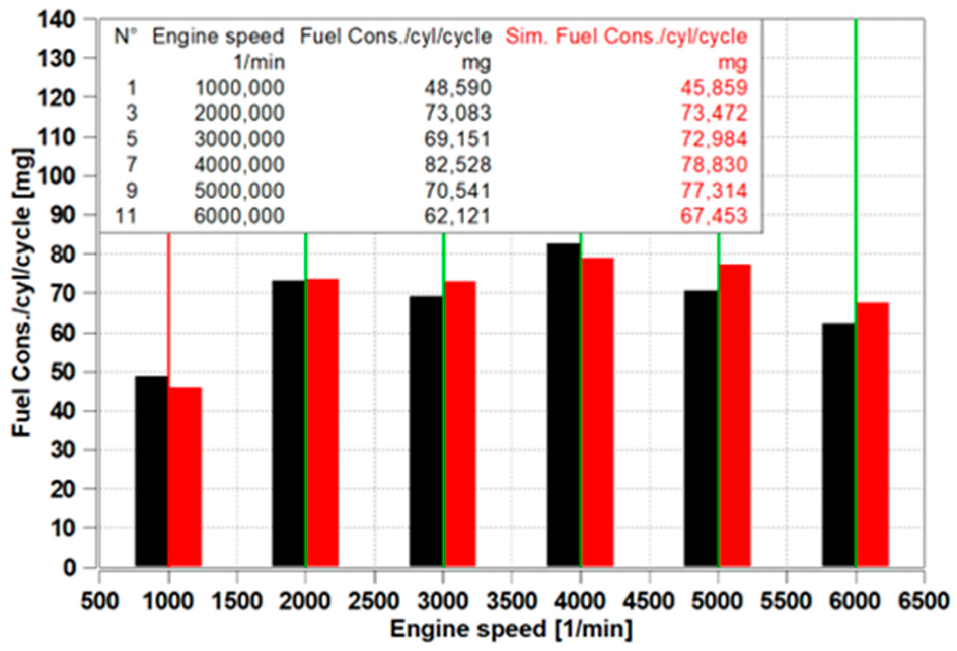 Figure 8. The maximum deviation between simulated and measured fuel consumption is 9.599%, while the minimum is 0.532%. The average deviation across all operating points is 5.730%, reflecting a moderate level of agreement between simulation and experimental results.