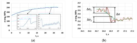The tensile test curves of the tested AlMg3 sheets show serrations of type A and A + B in strain rates in the range of 10−3 s−1. As a starting point, it is useful to consider Figure 1a, which shows two highlighted details of the engineering stress–time curve. At the beginning of the curve, type A serrations can be observed (for example, at 13 s, there is 5.8% axial strain; see the left magnified window), which change from ~18 s (~9% strain) to A + B type, with characteristic B-type sections. Figure 1b shows the approximation of smaller-amplitude serrations (red line) following a higher stress drop, with a reference function (green line) and the amplitude interpretation of the Δσ stress serration from the upper peak to the lower valley. At the same time, the deviations from the upper and lower peaks to the reference function are Δσ1 and Δσ2; the sum of them does not equal the value of Δσ. Therefore, a detailed investigation is necessary to determine how the different analyses based on deviations from the reference function differ from each other.