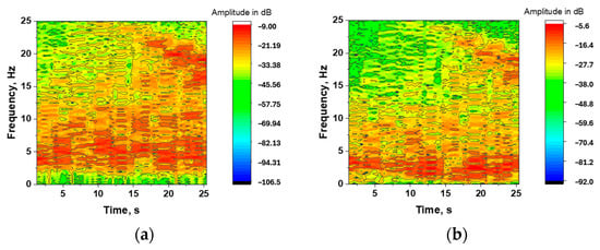 Of course, the studies also covered the reference function calculated from the moving average. In this case, the approximation also strongly depends on the chosen window size, and, to be comparable with the Saviczky-Golay smoothing, a 21-point window was also used. The tests showed that the Savitzky–Golay smoothing follows the engineering stress–time function more accurately than the reference function calculated from the moving average. Figure 5a,b shows the Short-Time Fourier Transform (STFT) values for the MA and SG data. It is obvious that there is a significant difference between the SG and MA charts. The MA peaks are higher, but the lower-frequency band is smaller (0–5 Hz) and the larger-frequency band is around 20 s is narrower. Taken together, this representation shows the differences between the two types of smoothing functions in the representation of the Δσ peaks and FFT spectrum.