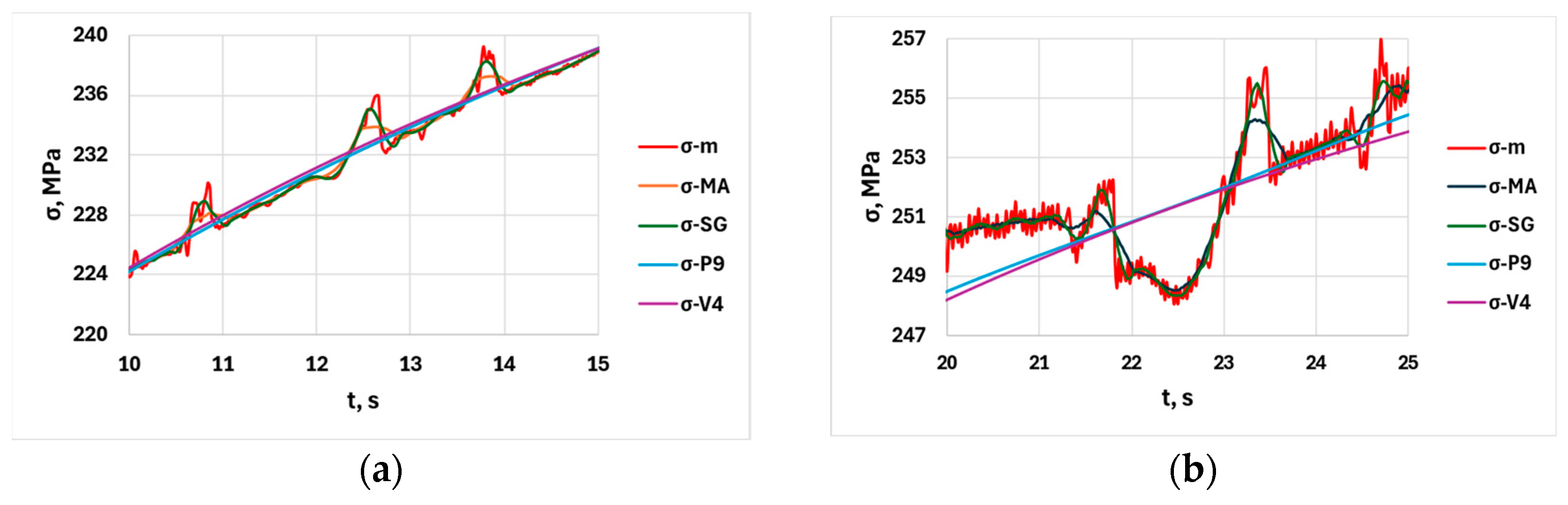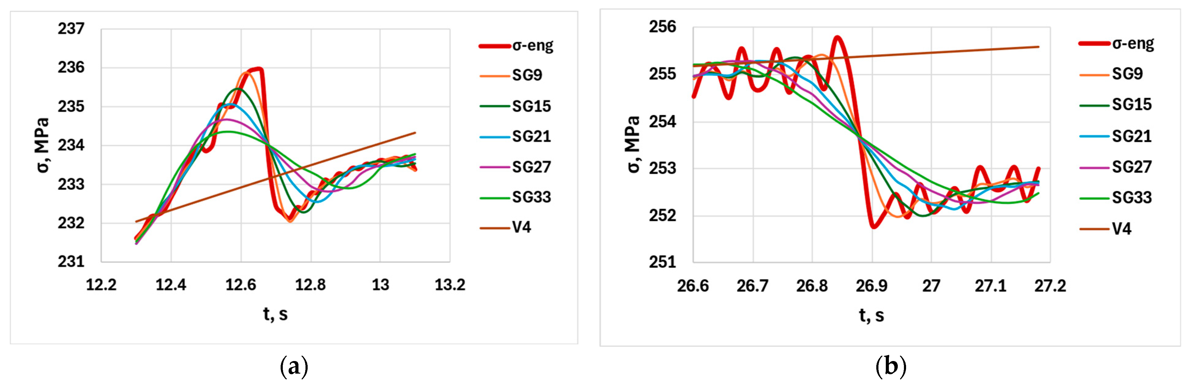 - The stress amplitudes calculated from the reference functions are strongly dependent on the window size of the smoothing functions. Between the analyzed SG9 and SG33 window sizes, the difference in the calculated stress amplitude is about 40%, and frequency characteristics show even more significant differences.