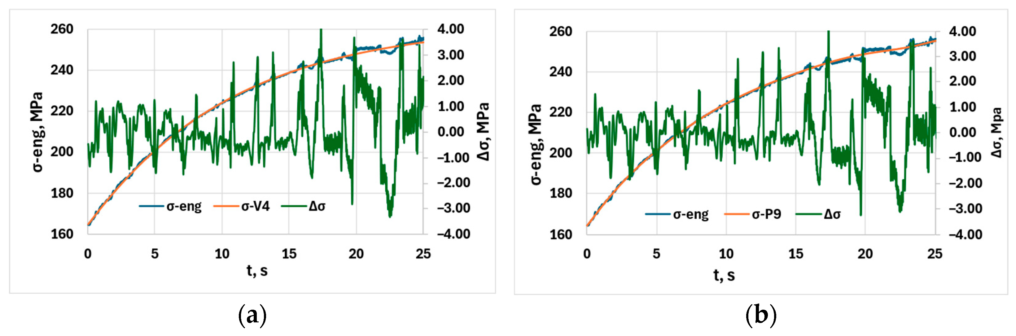 - The analytical approximation functions Voce4 and Polynom9 are fitted to the whole domain, so they do not follow significant engineering stress changes. For this reason, the derived serration amplitude–time functions are less suitable for further FFT or other statistical analyses.