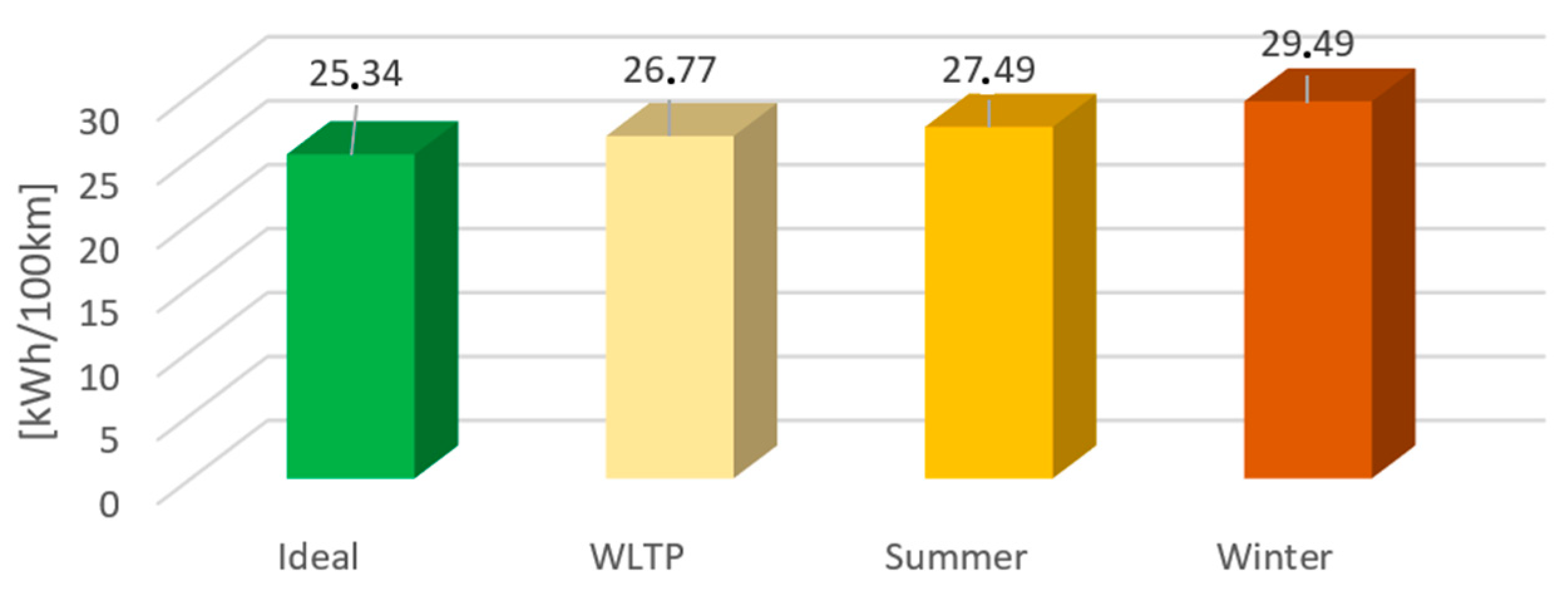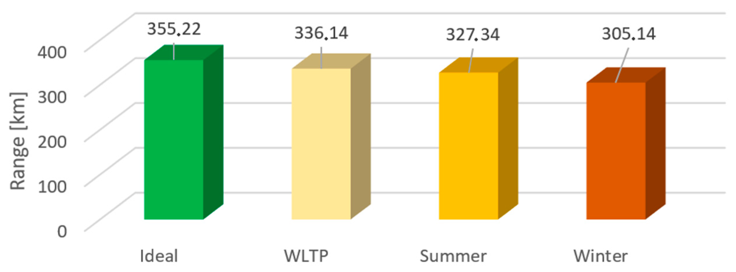 Figure 5. The simulation was performed with a battery capacity of 100 kWh and with its SoC at 90%. The range calculated according to the WLTP cycle decreases further during summer operation and decreases further in winter when heating is required.