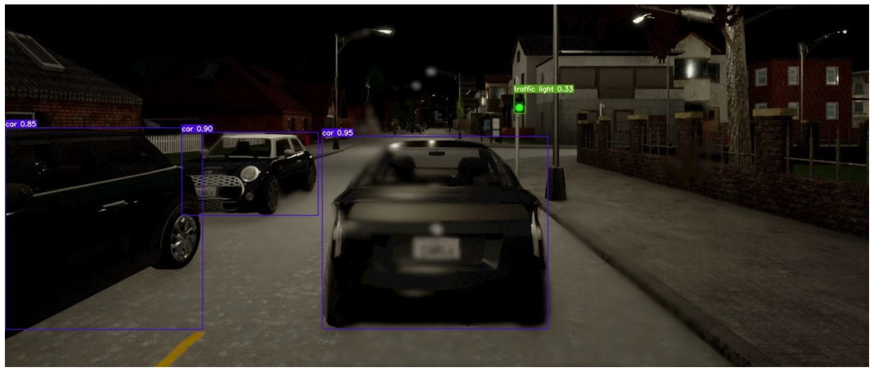 To test the model under challenging conditions, two weather presets were used in CARLA. The critical weather setup included 90% cloudiness, 90% precipitation, 80% precipitation deposits, 50% wind intensity, 90% fog density, and 100% surface wetness, simulating an extreme low-visibility scenario with a low sun angle (−5°). In addition, a nighttime scenario was created with 80% cloudiness, 100% precipitation, and a sun altitude angle of −10°, representing heavy rain in near-darkness. These configurations aimed to evaluate detection performance under high-variance environmental conditions.
