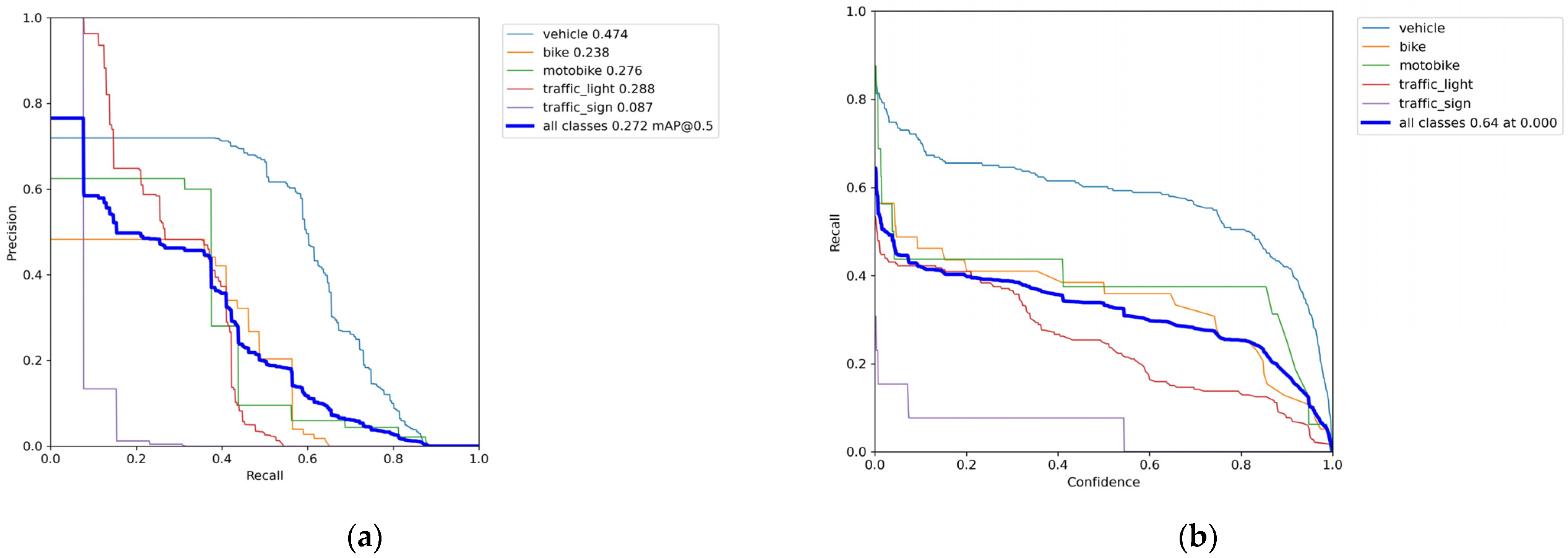 Figure 4a presents the precision–recall curves and average precision (AP) for each model class. The vehicle class performs reasonably well, with an AP value of 0.474, supported by a balanced precision–recall curve. The traffic light (0.288) and motobike (0.276) classes also perform acceptably, although they are characterized by high precision and low recall, meaning that they are less frequent but more accurate. The AP value of the bike class is lower at 0.238, and its curve drops rapidly, indicating that many detections are missing or incorrect. The traffic sign class performs the worst (0.087), as shown by its curve rapidly approaching 0, indicating few correct detections and many false detections. The mAP@0.5 value calculated for the entire model is 0.272, which indicates moderate performance, especially due to the weaker recognition of smaller and visually complex classes.