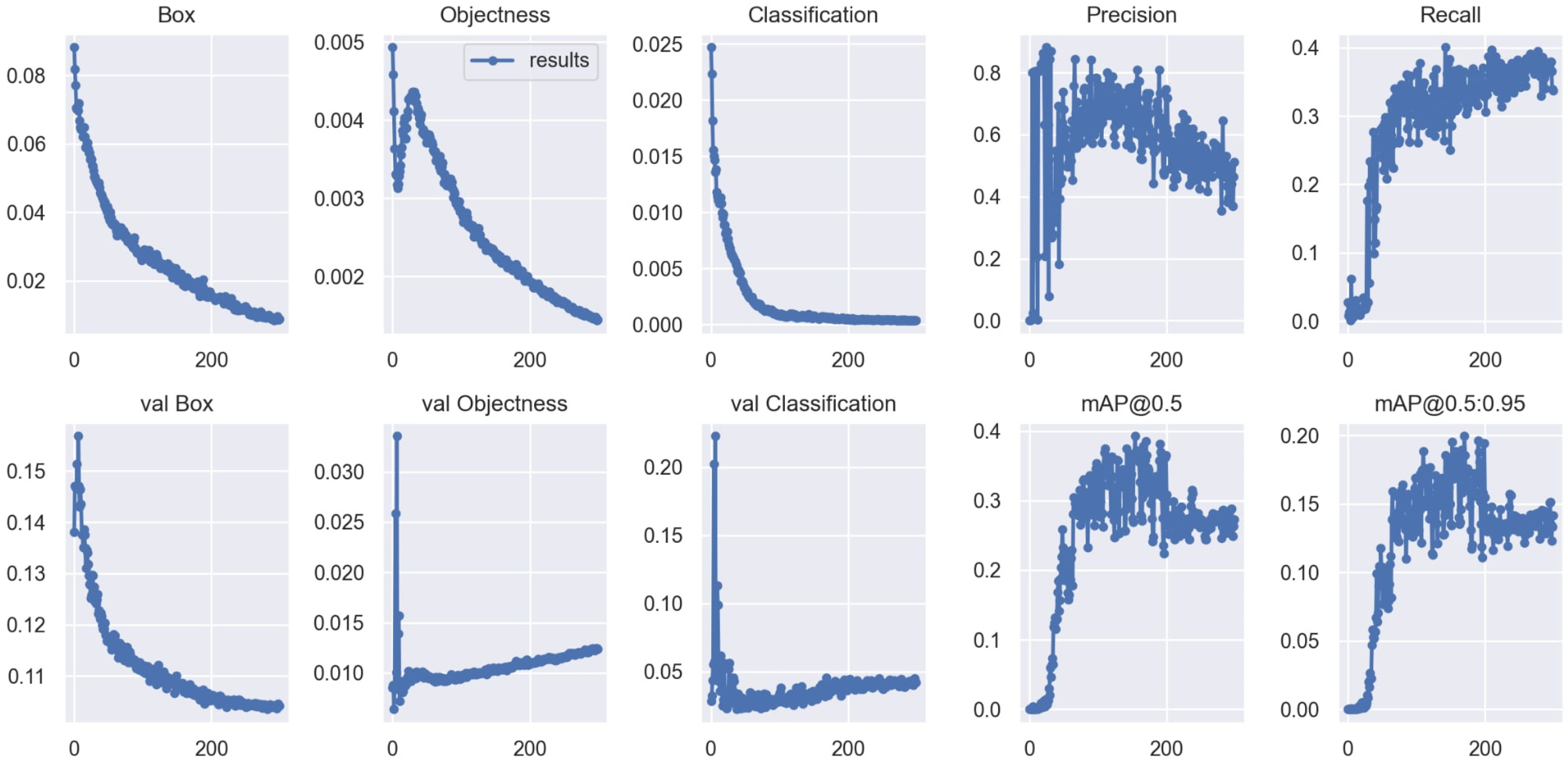 Figure 5 illustrates the development of the model training and validation process along different metrics, by epoch. The top row shows the values for the training data, while the bottom row shows the values for the validation data. In the case of the loss functions (box, objectness, classification), it is clear that all components decrease continuously during training, indicating the convergence of the model and the effectiveness of the learning process. In terms of validation losses, box and classification losses show a similar decreasing trend, but objectness loss begins to rise slightly in later epochs, which could indicate overfitting. The accuracy metrics, precision, recall, mAP@0.5, and mAP@0.5:0.95, stabilize over the learning process. The precision value is between 0.6 and 0.7, the recall is around 0.4, while the mean average precision (mAP@0.5) reaches 0.3. The stricter mean average precision (mAP@0.5:0.95) value ranges between 0.15 and 0.2, indicating moderate object recognition performance. It can be concluded that the model learns effectively, which is reflected in the improvement of the metrics. However, based on the increase in validation objectness loss and moderate mAP values, it might be worth improving performance with further development or data augmentation, especially for object classes that are more difficult to identify.