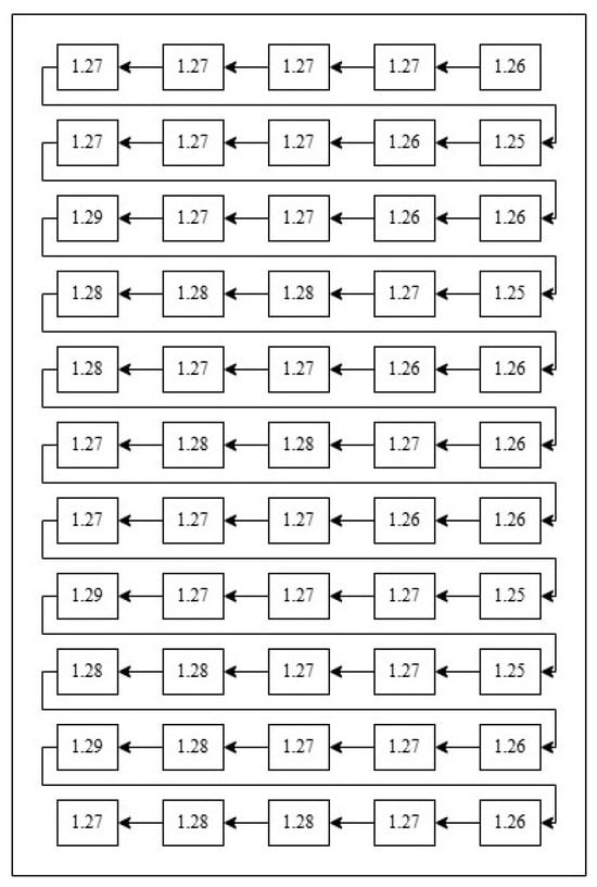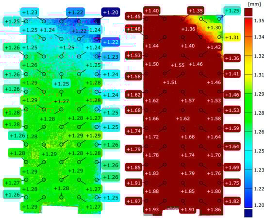 As shown in Figure 4, the GOM ATOS system has a similar order of measurement points to those on the reference measurement using the micrometer (Figure 1). When collecting the results for each measurement, they were recorded sequentially from top to bottom on the sheet surface.