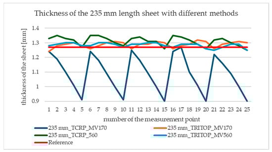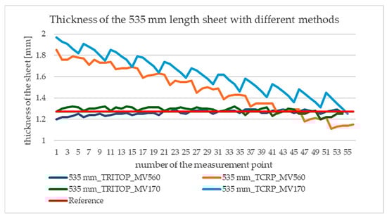 The diagrams in Figure 2 and Figure 3 show the measured points on the surface. In both cases, the reference sheet thickness of 1.27 mm is marked by a red, thick line.