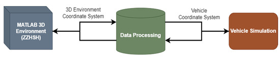 The 3D environment simulation is implemented in the Simulink model by means of the Simulation 3D Scene from Vehicle Dynamic Blockset [12]. The ZalaZONE 3D Scene has been developed for the purpose of simulating high-speed vehicle manoeuvres, with a particular focus on steering, damping, braking, and acceleration performance. As demonstrated in Figure 1, the 3D simulation data is interconnected with the vehicle model through a series of data processing operations. This data processing is important to change the 3D world data from the simulation coordinate system to the vehicle coordinate system. The interface between the vehicle model framework and the 3D environment is a Vehicle Body 3DOF Dual Track Block. The X, Y coordinate and heading information is forwarded to the 3D environment, and the feedback data from the Simulation 3D Actor Transform Get block is then transmitted to the vehicle simulation framework input. The subsequent subsection will provide a comprehensive overview of the vehicle model framework.
