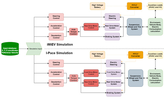 In order to conduct a simulation, it is necessary to select an actor, i.e., the vehicle. In relation to the vehicle, it is imperative that we consider the integration of vehicles into the environment. The utilisation of a BEV was of paramount importance. It is imperative to possess a comprehensive understanding of the vehicle systems in order to facilitate the effective implementation of the subsystems. It should be noted that, in order to facilitate subsequent validation, it was necessary to utilise vehicles that were available for real-time validation. In this instance, a simulation model for two BEVs was created. The two vehicles under scrutiny are the Mitsubishi i-MiEV (manufactured by Mitsubishi Motors Corporation in Tokyo, Japan) and the Jaguar i-Pace (manufactured by Jaguar Land Rover in Coventry, United Kingdom). The selection of these two vehicles was made on the basis that, at the time of writing, these two pure electric vehicles were physically available for a more accurate calibration of the simulation. As demonstrated in Table 1, it is evident that a range of OEMs adopt varied approaches when designing and constructing BEVs. In the design process of the aforementioned vehicles, Mitsubishi and Jaguar adopted different perspectives.