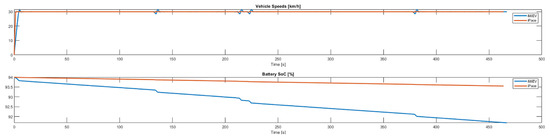The utilisation of a fixed speed profile through the ZZHSH on Proving Ground has been demonstrated to be a reliable method of assessing the power consumption differences between vehicles. The speed in question was defined as 30 km/h. This was determined to be the optimal speed for navigating the corners without causing significant tyre slippage in either vehicle. The result is demonstrated in Figure 5, in which the vehicle velocity and the SOC level of the vehicle are presented based on elapsed time.