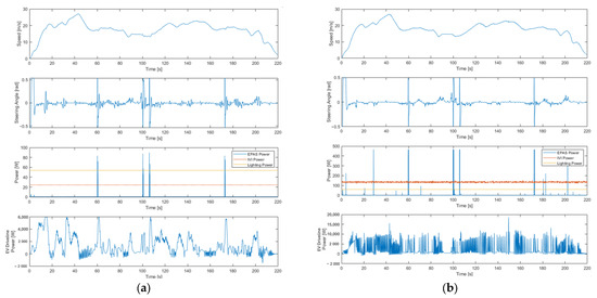 The final scenario considered was the ZZHSH track usage with a realistic speed profile. In this particular scenario, the focus is on the investigation of the functionality of the implemented electrical subsystems. In this particular instance, the activation of a low-voltage subsystem was also initiated. In both cases, the vehicle’s low-beam headlamp function was engaged, and the radio was adjusted to a low volume setting. In this particular instance, it is imperative to consider the energy consumption of the EPAS. The subsystem power consumption is illustrated in Figure 6. The figure’s upper subplots illustrate the vehicle’s velocity and the angle of its steering for the purpose of reference. As illustrated in the lower subplots of the figures, the actual consumption of the electric subsystem and propulsion system consumption is demonstrated.