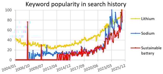 While lithium-ion batteries (LIBs) currently dominate high-performance applications, their widespread adoption faces increasing scrutiny due to several pressing challenges. These include critical mineral scarcity, particularly concerning lithium and cobalt, and the high environmental impact associated with their extraction and processing. Furthermore, limited recyclability and significant geopolitical risks linked to complex supply chains pose substantial long-term sustainability and security concerns, as highlighted by different publications [,,]. These growing limitations underscore the urgent necessity of exploring alternative battery chemistries. Consequently, increasing global interest in SIBs reflected in geographic search trends and supported by sustainability goals signals a growing role for sodium-based solutions in cost-sensitive and regionally constrained energy markets. This study explores how public perception, material availability, and technological advancements converge to shape the future of battery adoption, particularly in light of these challenges.