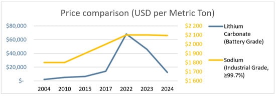 This figure shows the comparison between lithium and sodium prices from 2004 to date.