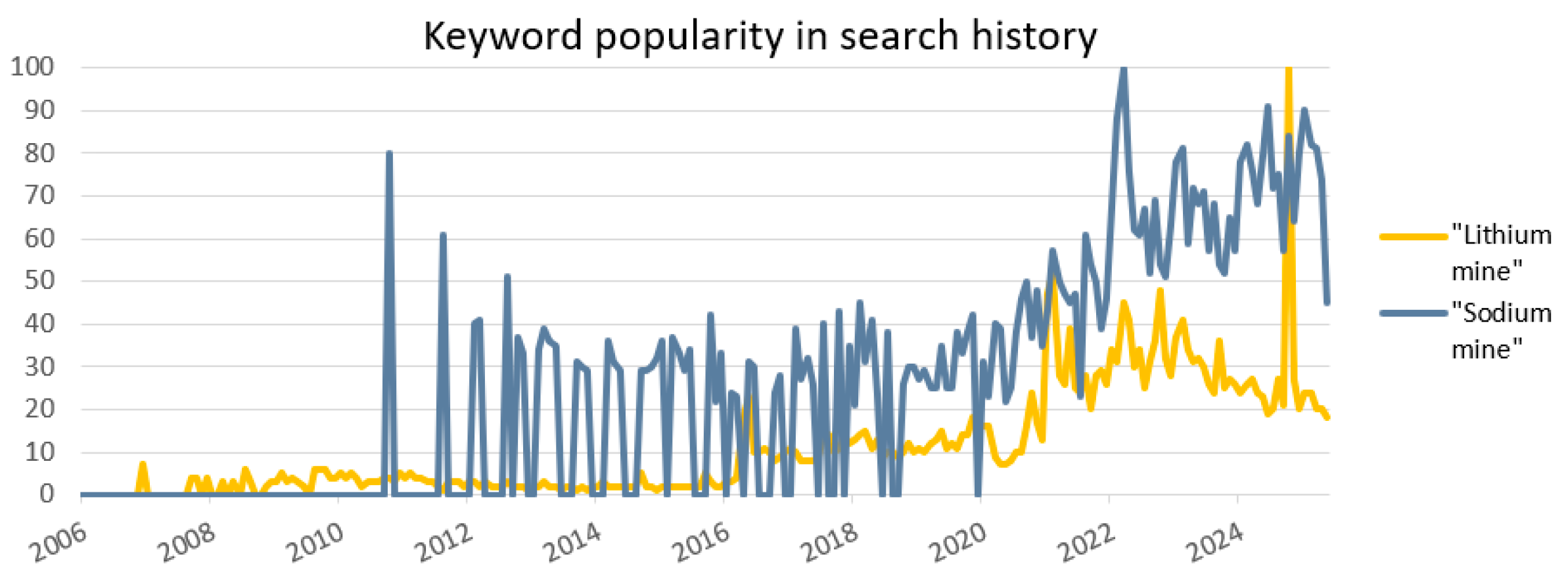 As salt becomes more and more useful and integrated into industrial and battery manufacturing applications, its popularity as a keyword is also increasing, which is backed by my popularity analysis between lithium and sodium below on
