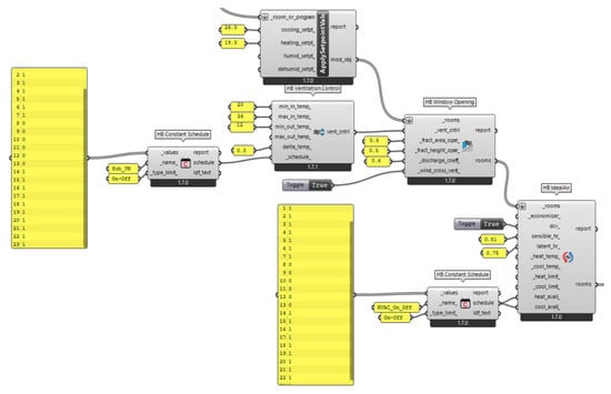 After defining the input parameters, the opening properties of the windows were determined for the whole building using the “HB Opening Window” module. The opening properties assigned to this module determine the type of ventilation during the simulation, which can be single-sided or wind-driven cross-ventilation.