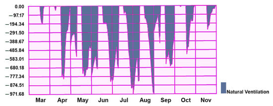 The resulting data were aggregated to obtain the annual energy demand reduction of the analyzed building for the retrofitted natural ventilation system. Figure 6 shows the distribution of the annual energy demand for the natural ventilation system with the given operating parameters. The temperature range of the natural ventilation system is 20–26 °C. The energy demand shown in the diagram is to be deducted from the energy demand of operating mechanical ventilation system, as this energy is not used for the building but for the environment.