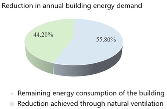 After the energy reduction, the remaining annual energy demand was reduced to close to half. As shown in Table 2, by operating the simulated natural ventilation system, the annual energy demand of the building was reduced by more than 44% (Figure 7).