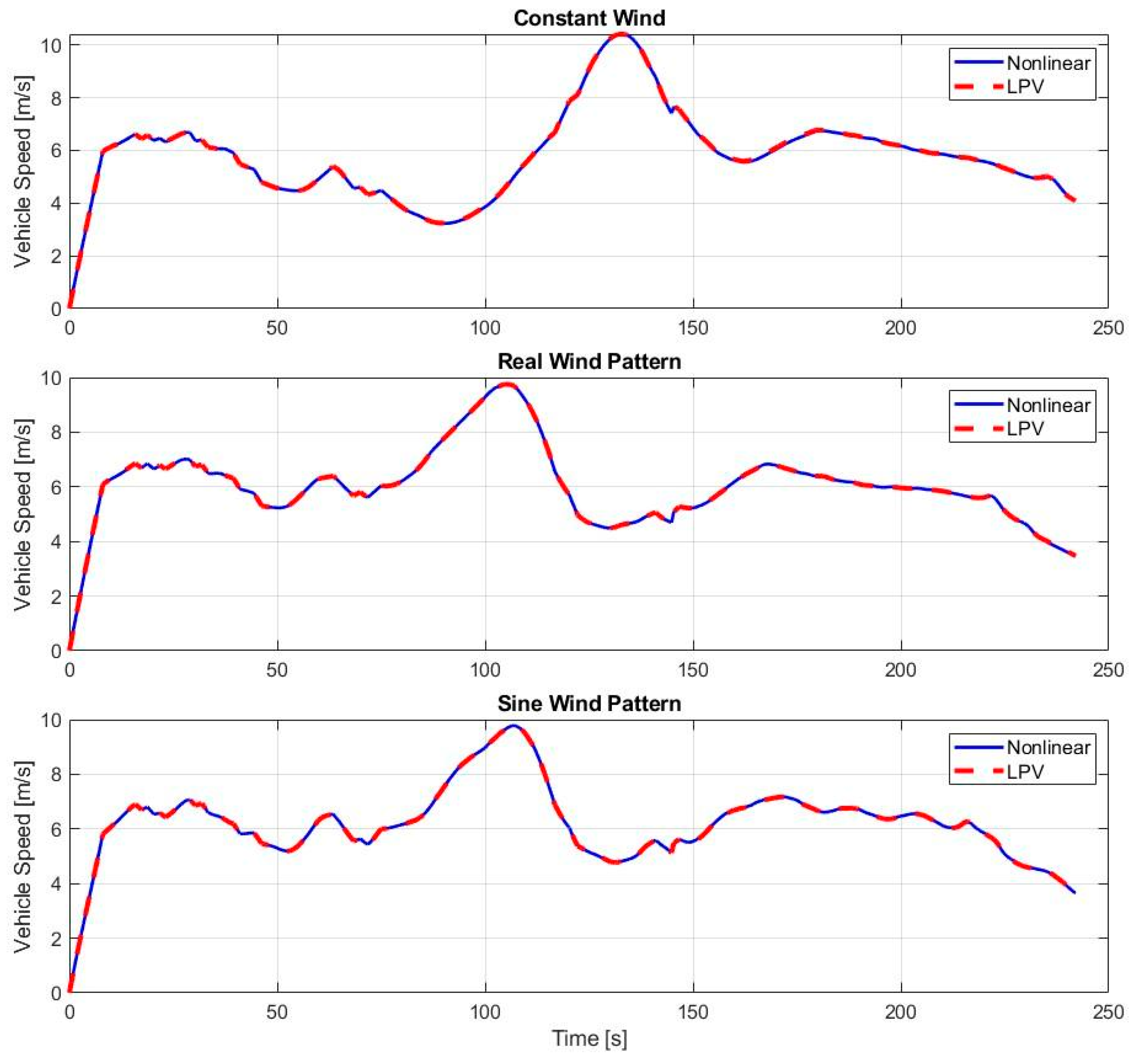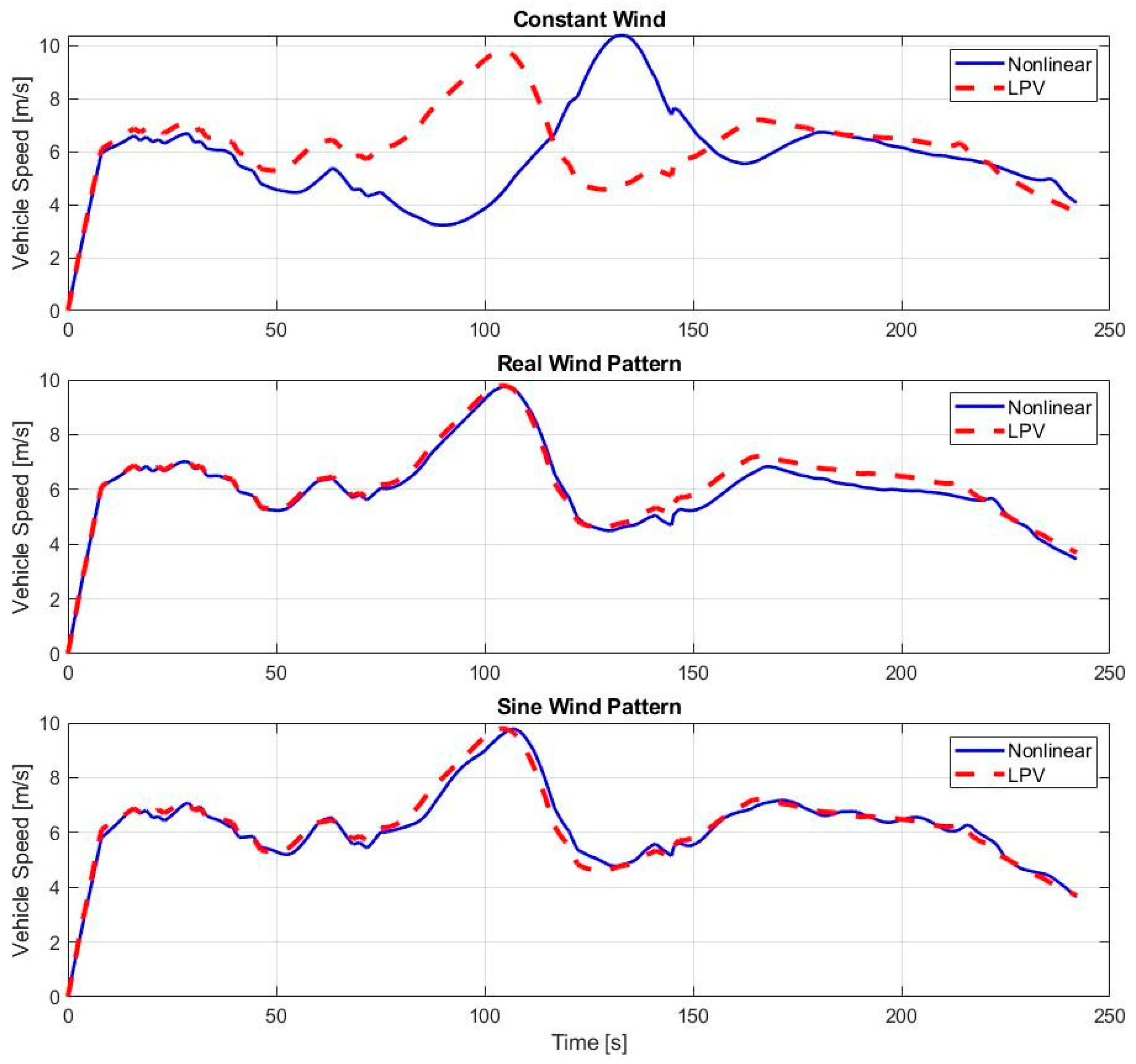 The previously developed LPV model can represent the measurement-based nonlinear vehicle model. However, in its original form, it does not account for wind effects. Wind is a significant factor for this lightweight vehicle, as clearly illustrated by the simulation comparison in