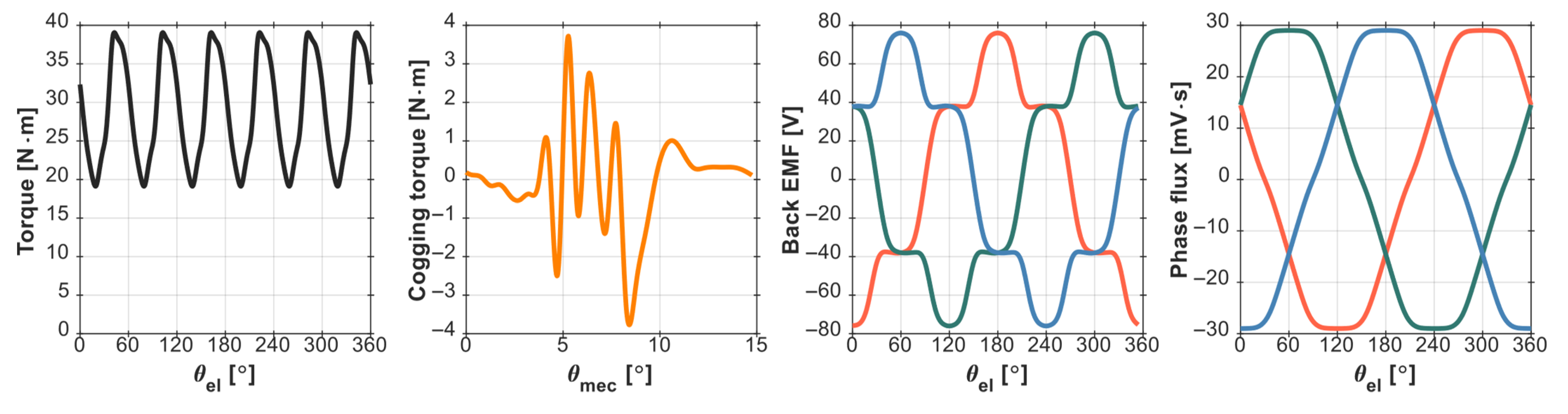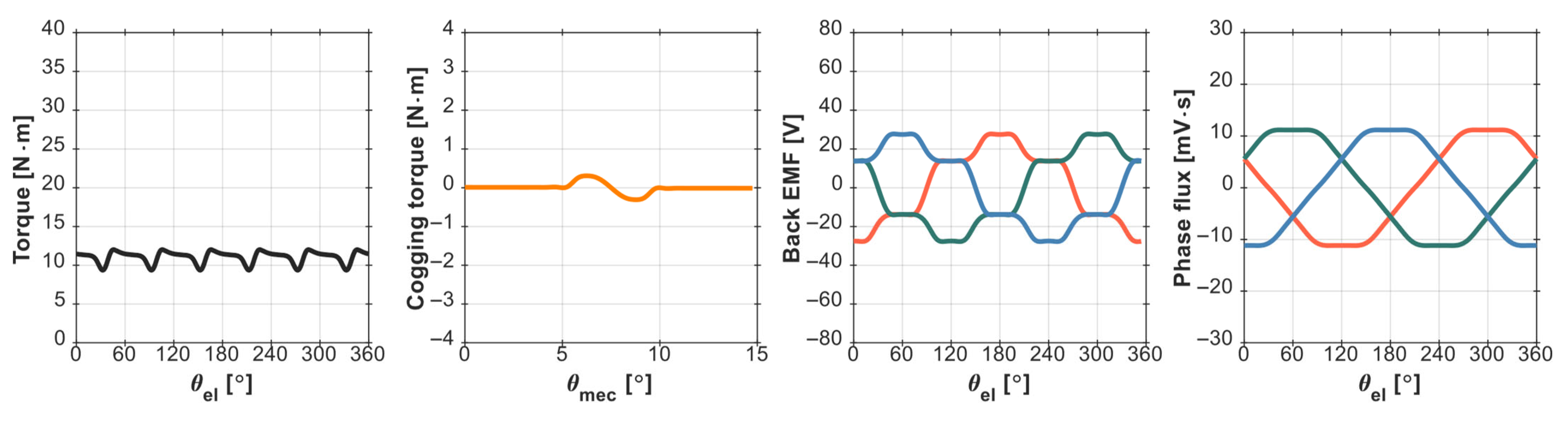 For the comparative study, the variation in four quantities was considered: torque, cogging torque, back-EMF, and phase magnetic flux. Their changes concerning angular displacement (θ) were plotted in MATLAB (R2025a) and are shown in