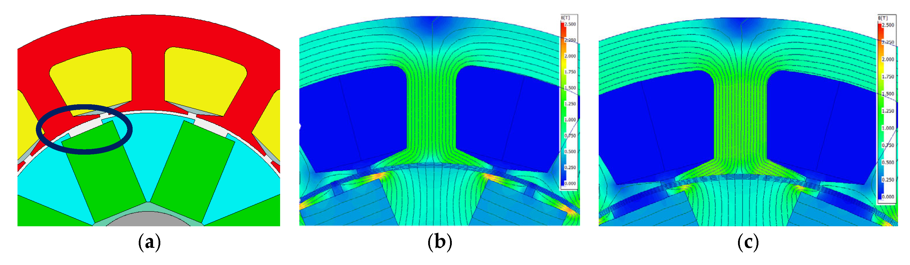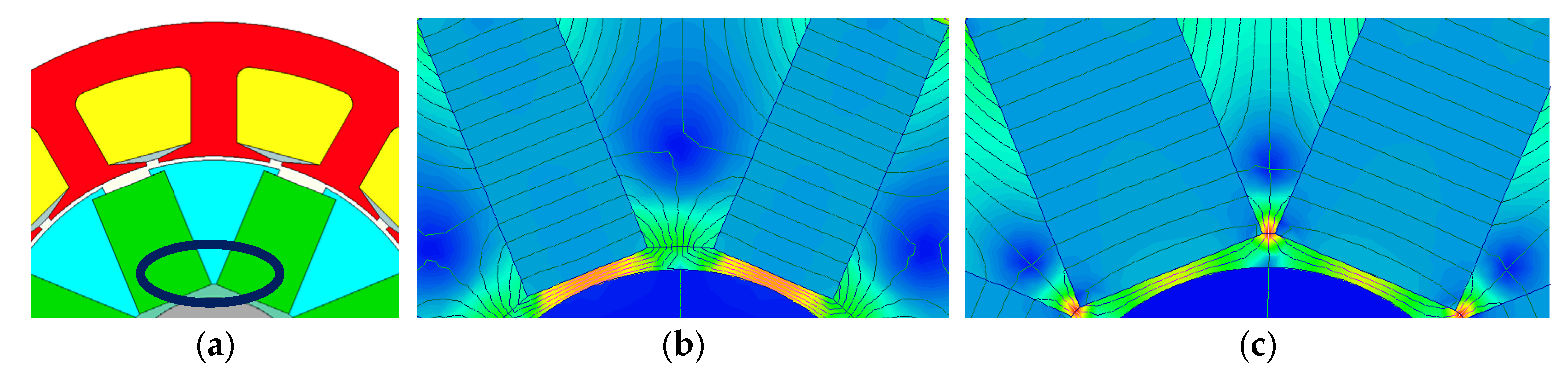 Figure 8a) critically impacts both electromagnetic performance and mechanical integrity, analogous to the inner end region of the rotor lamination previously discussed. This opening dimension directly influences air-gap magnetic flux concentration (see the magnetic flux distributions provided in