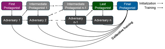 The number of adversaries was determined with early stopping. After each iteration, we evaluated the previous protagonist’s performance on this new adversary. If the episode reward of the protagonist did not decrease compared to the previous iteration, the iterative training process was stopped, and the final collective training step followed.