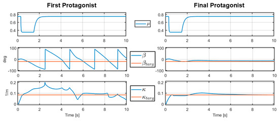 Figure 3 shows a scope graph of a 10 s long simulation in a case where the adhesion coefficient drops during the drift initiation phase from to , stays there for a while, then increases back to . This case is a representation of a real-world event where the car would traverse onto a heavily wet or snow-covered area of the road during a drift initiation phase, then proceed to a dry asphalt surface again. In the figure, the first row shows the changes in the adhesion coefficient , the second row shows the side slip angle and the target , and the third row shows the path curvature and the target . While they are not shown in the figure, the longitudinal state variables , , and the actuator commands and in the first protagonist’s case are similar to the ones shown in the left column in Figure 2. This is also true for the final protagonist, but with the right column in Figure 2.