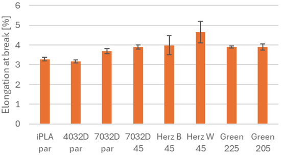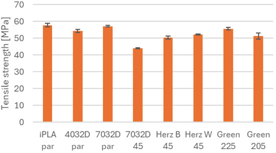 Results for the Ingeo 7032D parallel and the green Philament are from previous research [21,22]. These results were used to extend the range of comparisons and to draw partial attention to the importance of the printing parameters, not just the raw materials, because users can set them freely.