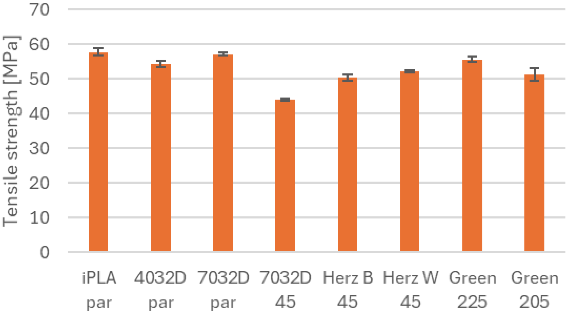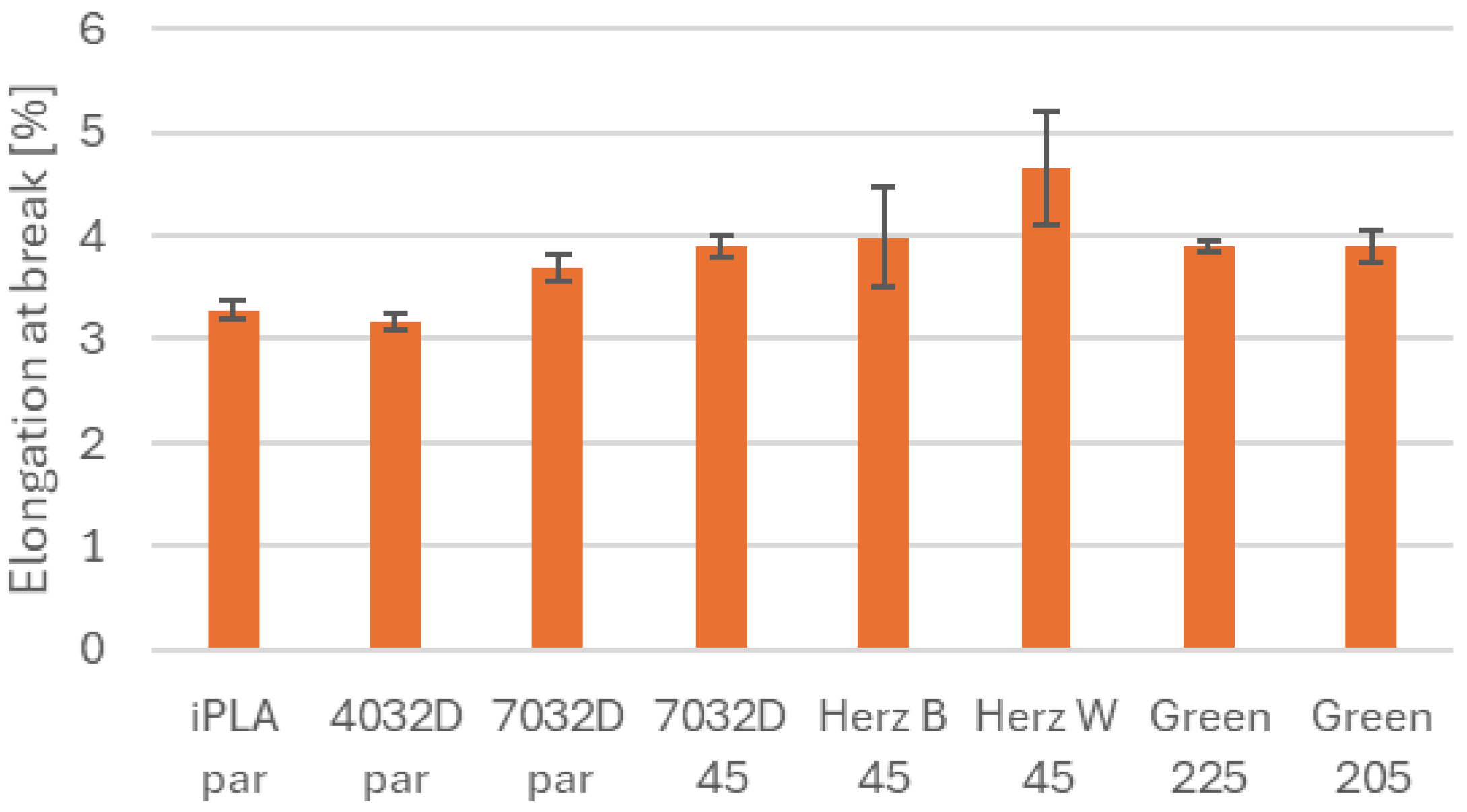 Figure 2 displays the tensile modulus values. Among the samples, the Ingeo 7032D with parallel orientation stands out. The 4032D, the iPLA, and the Herz types have similar stiffness. The green Philament has a similar value to the 45° Ingeo 7032D, they have the same printing orientation. The materials that perform better in impact strength are more flexible and therefore have a lower tensile modulus, except for the parallel 7032D, which has a higher impact strength in addition to its stiffer structure.