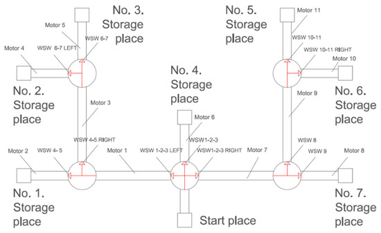 This paper presents a control model for a system that includes roller tracks and route switches. The goal is to enable users to control the system using natural language commands, reducing the need for traditional programming interfaces. The system is designed to direct packages to one of seven possible storage locations. By specifying a destination in natural language (e.g., “Storage location 1”), the control system activates the appropriate rollers and switches to guide the package along the correct route. For example, if the user specifies “Storage location 1,” the system interprets this input, calculates the required path, and actuates the necessary components. In this case, the package would start from the initial point, turn left at the first switch, and continue straight to the final destination. Users can also specify operational parameters like speed, e.g., “Storage location 1, 50% speed” instructs the rollers to operate at half speed. Figure 1 illustrates the model layout. Arrows indicate possible routes, and “WSW” labels represent way switches.