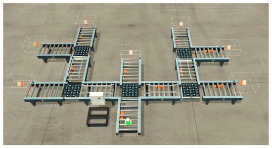 The development and testing environment was designed to integrate natural language processing with industrial control systems. All programming was performed in Visual Studio Code, using Python 3.10 as the primary language. The natural language interface was powered by LLaMA 3 large language model (in its pre-trained form), which interprets user instructions and maps them to control actions. For the physical control layer, a Siemens S7-1500 PLC (Siemens Zrt., Budapest, Hungary) was used. This controller is well-suited for industrial applications due to its robustness, modular architecture, and support for Modbus communication. System simulations were conducted in Factory IO (v2.5.8), which provided a realistic 3D environment for modeling conveyor systems, actuators, and sensors. Figure 3 depicts the model. This allowed for safe and controlled testing of the AI-driven control logic before deployment to the physical PLC. The integration of these components enabled the seamless execution of natural language commands in a simulated industrial environment, bridging AI with programmable logic control.