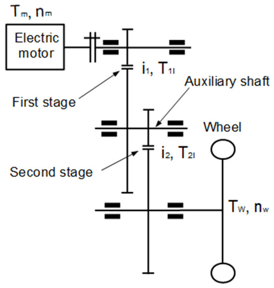 Taking into account the parameters of the two-stage gearbox, a single-stage gearbox has been defined whose gear ratio is equal to the total gear ratio of the two-stage gearbox, which is determined by the following Equation (18):