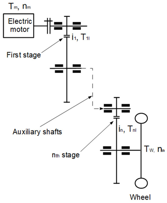 It is not practical to sum up the losses of the stages in the form of torque, since during the energetic analysis of the gear unit, losses must be determined in the form of power, and since different loss torques are associated with different shaft speeds, it is therefore worthwhile to convert the loss torque to loss power (P1l, …, Pnl) for each stage using the following Equation (13):