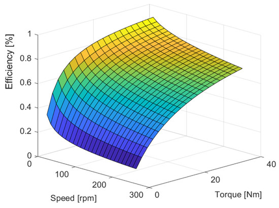 The parameters of the two-speed model under investigation are given by a Bosch bicycle drive, where the maximum power of the drive is 250 W and the maximum torque is 40 Nm. The drive parameter vector is as shown in Equations (16) and (17):