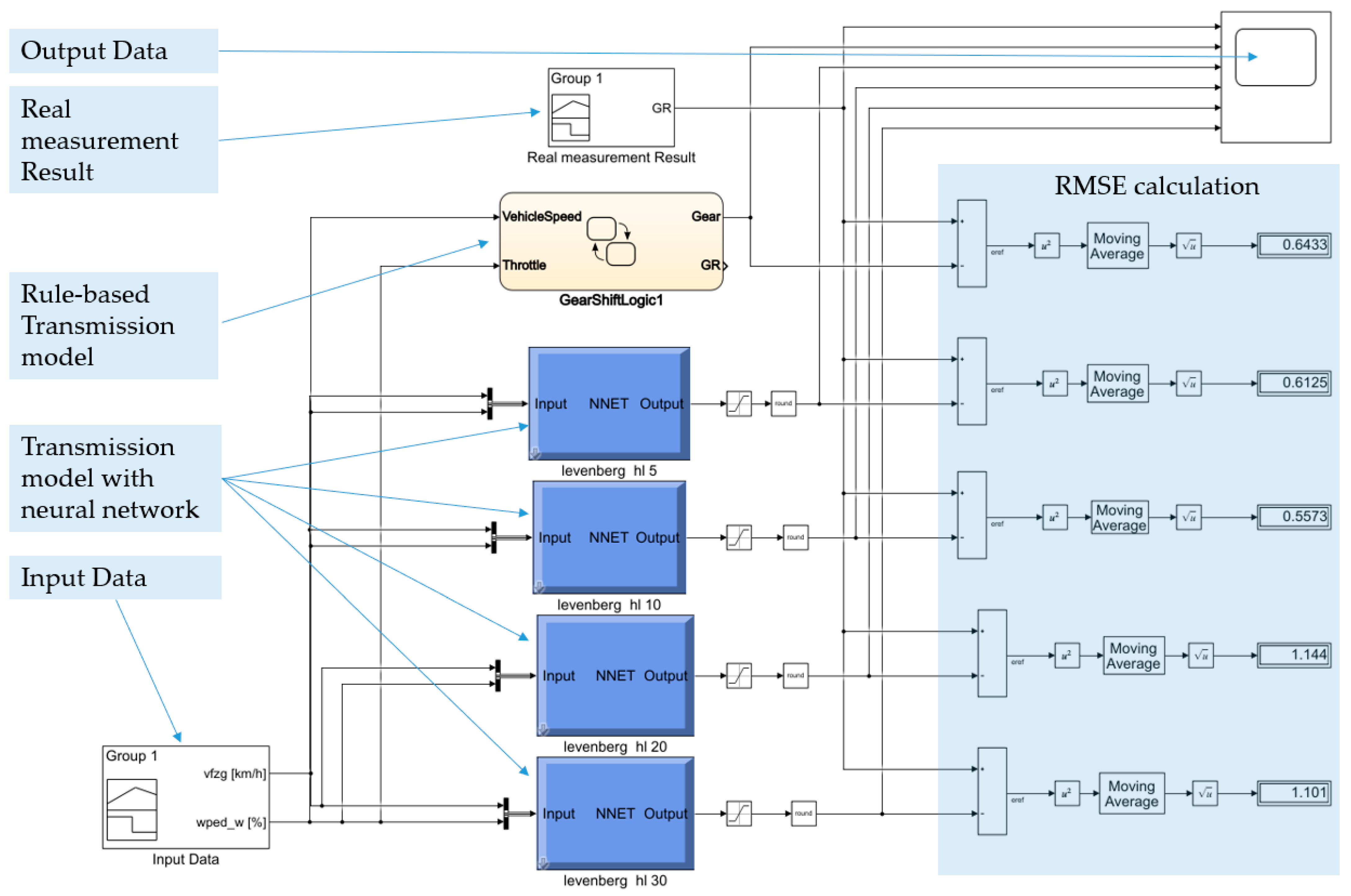 Figure 3 shows the test environment created in Simulink, where the generated neural network was validated based on real data. The traditional transmission model was compared with the transmission data measured during vehicle testing. The results obtained provide a reference basis for comparing the models generated by the neural network. Levenberg–Marquardt (LM), Scaled Conjugate Gradient (SCG), and Bayesian Neural Networks (BNN) are the three most common methods for creating neural networks. Since all three methods are different from each other, we examined which method proved to be the most effective in our case. The Levenberg–Marquardt (LM) algorithm is a hybrid optimization method that combines gradient descent and the Newton method. This method is often used for small and medium-sized problems because it offers fast convergence and efficient solutions for nonlinear fitting tasks.