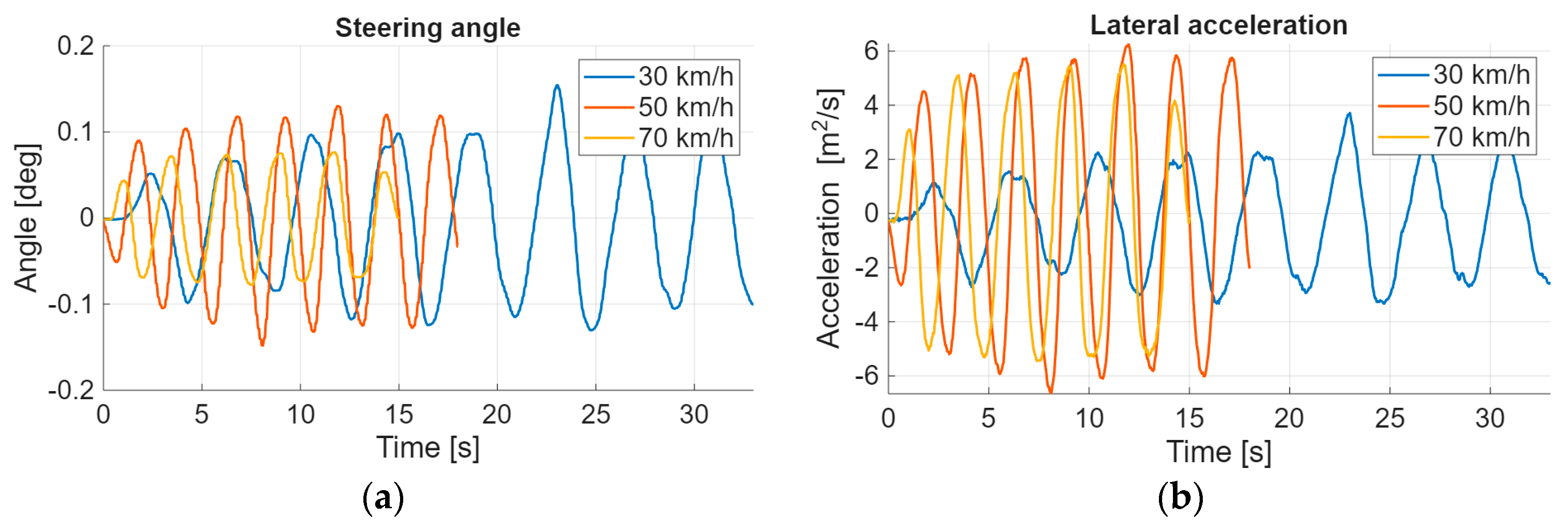 During the slalom tests, the vehicle is moving in a slalom at different speeds. These speeds were 30, 50, and 70 km/h. The vehicle was driven by a driver. The tests were carried out three times at each speed. The measurements could not be repeated with sufficient accuracy, and the average speeds and lateral accelerations also differed between the various tests, but the extent of the differences between the two measured signals varied equally, and the spectral representations were also very similar. For this reason, it makes no sense to examine cross-correlation here. Only one measurement per speed is shown. The measured quantities are shown in
