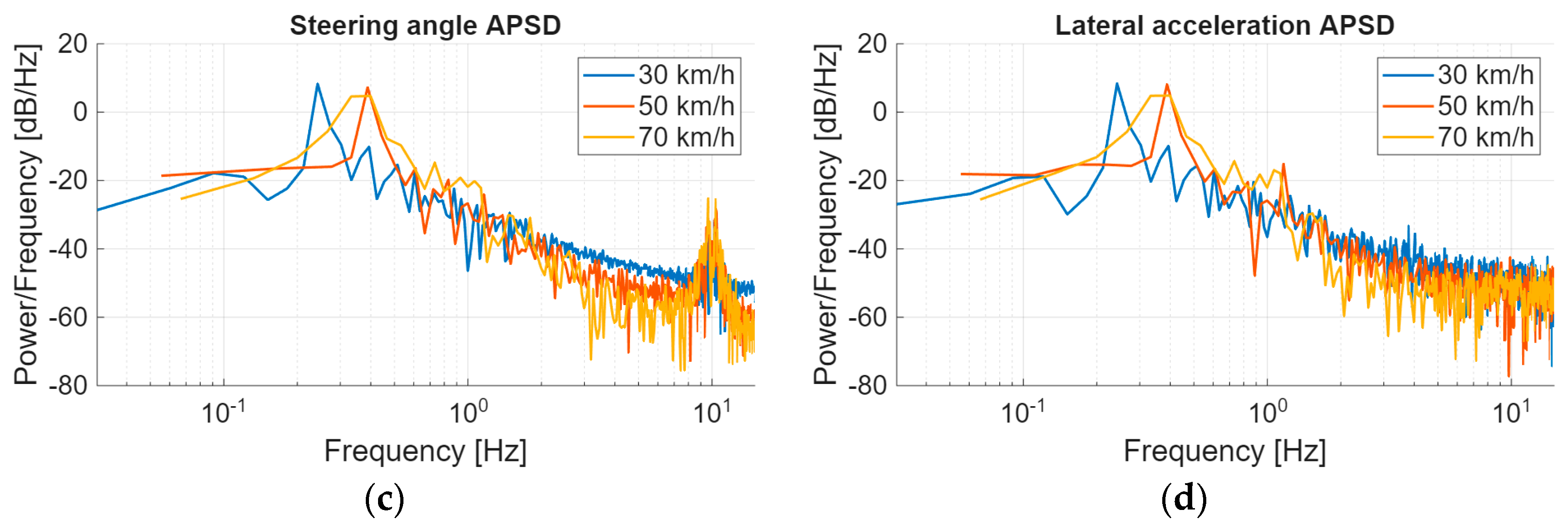 During these tests, the vehicle was more highly excited, close to its limits, especially at high speeds. It can be seen that even with this excitation, the normalized APSD remains below −40 dB in the range above 3 Hz, confirming that the vehicle’s lateral dynamics are interesting below 3 Hz, above which there is only noise.