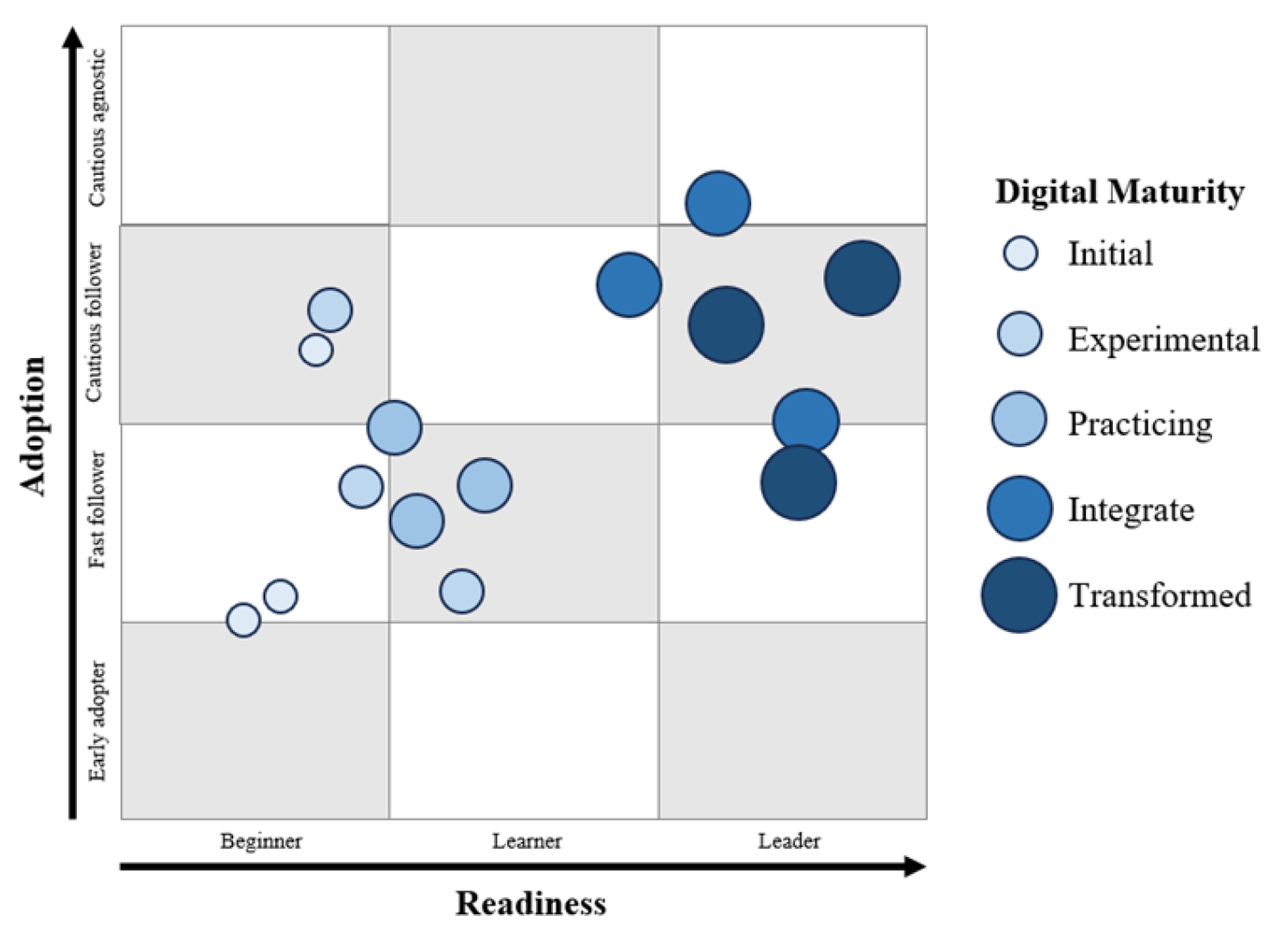 14] visualizes their differences based on potential gains or losses and the adoption timeline. Early adopters are defined as the pioneers in exploring a project that may face the highest uncertainty due to a lack of historical experiments, while the latest adopter is a cautious agnostic who needs more reassurance for their adoption decision. Readiness refers to a metric that measures the company’s readiness to start using the technology and become a leader in that area. The hierarchy of readiness level goes from knowing nothing—an outsider—to a leading position—a top performer [