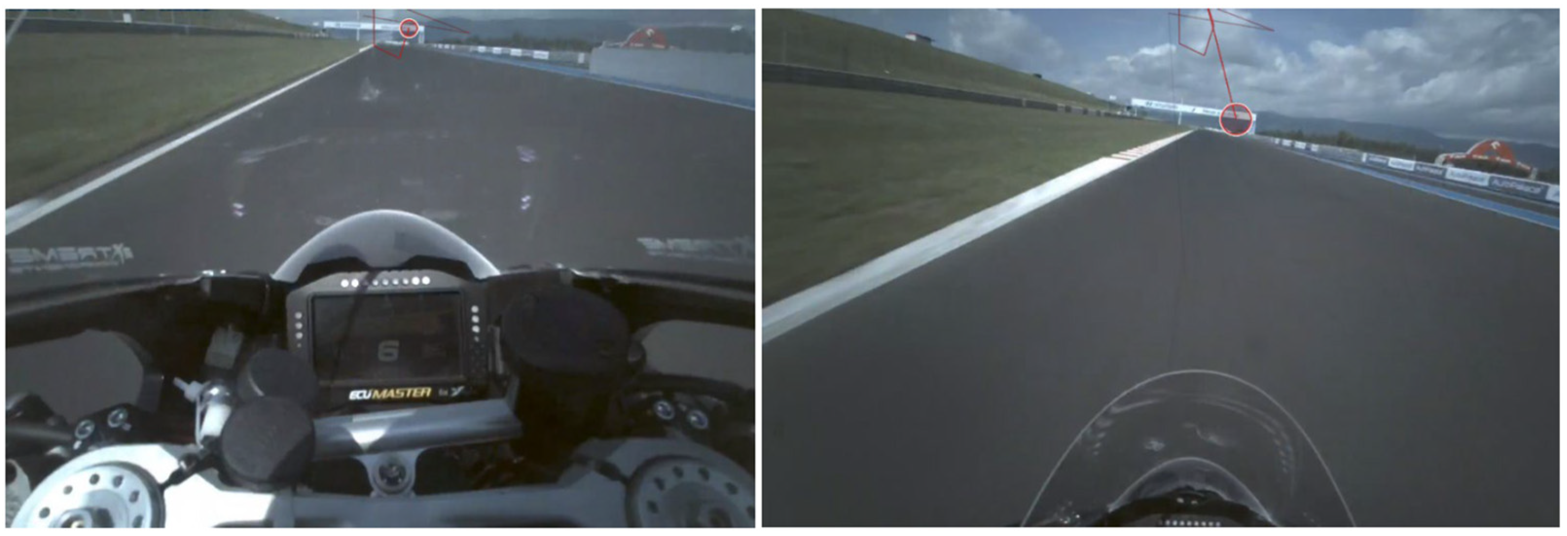 The methodology is further validated using data collected from multiple riding sessions conducted under varying track conditions. The recorded data demonstrates consistency and supports the observed trend linking the rider’s gaze direction with track line selection and braking points. These findings enable the application of eye-tracking technology to analyze suboptimal decision-making in motorcycle control, with a measurable impact on rider performance within specific track sectors.