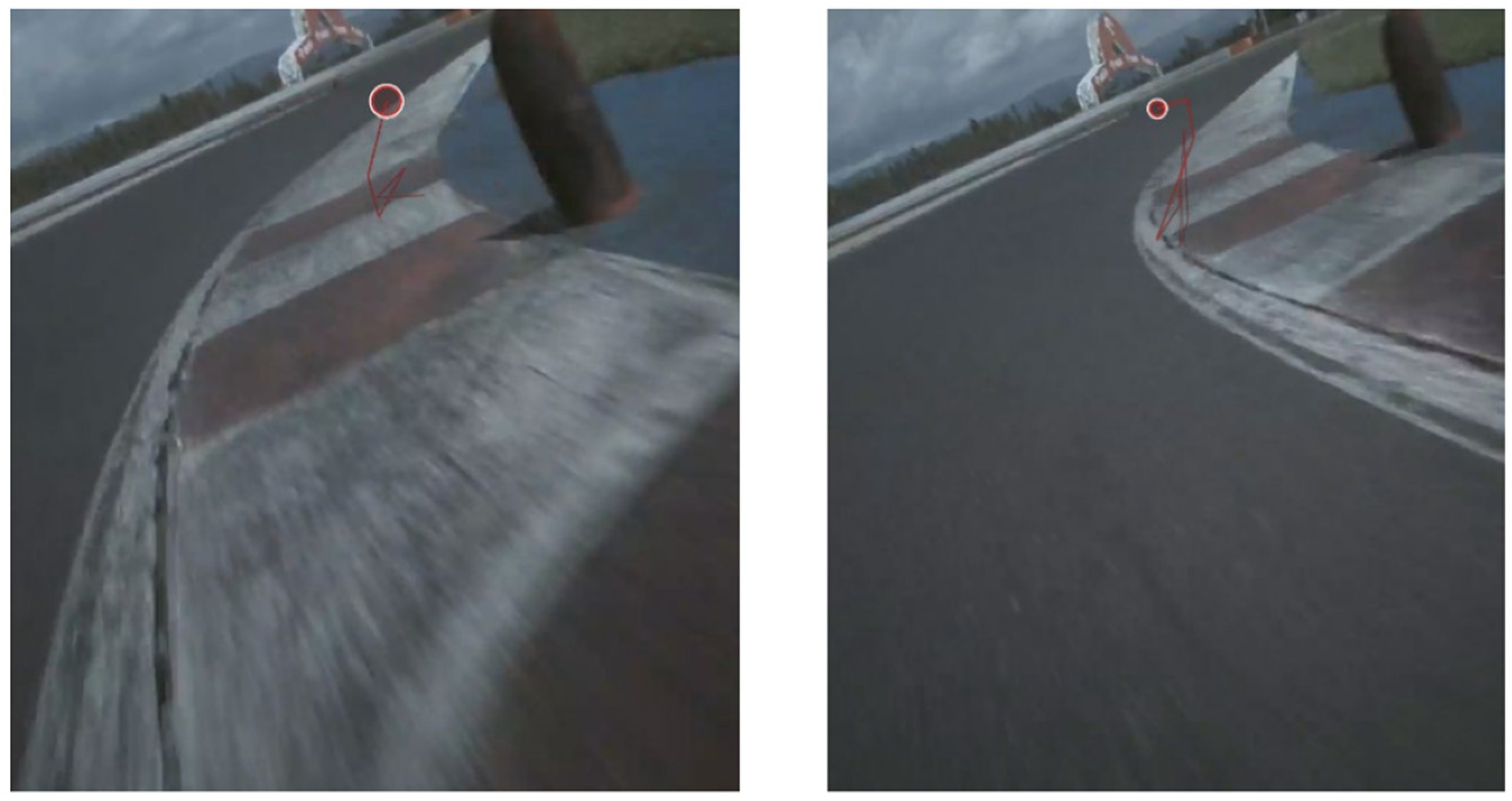 Table 4) reveals marked differences in both trajectory smoothness and visual attention dynamics. During the first and fastest lap, the rider maintained a stable gaze directed toward the corner apex, with minimal visual distraction. In the second lap, however, the rider’s gaze was directed deeper into the turn, accompanied by increased visual dispersion and a less effective trajectory. These findings suggest a strong correlation between visual fixation behavior and optimal trajectory selection (