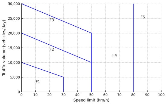 The most conservative CROW manual is used in the Netherlands, permitting mixed traffic in urban areas at speeds of less than 30 km/h and 5000 vehicles per day []. Only the safest environments are allowed for cyclist-vehicle interaction as a result to this threshold. Beyond 50 km/h or 15,000 vehicles per day, segregation is advised by Hungary and Slovakia using a matrix that also takes road type and connectivity into account []. Segregation is advised above these speeds. Slovakia’s TP 085 permits mixed traffic up to 30 km/h and 10,000 vehicles per day, and cycle lanes up to 50 km/h and 20,000 vehicles per day [].