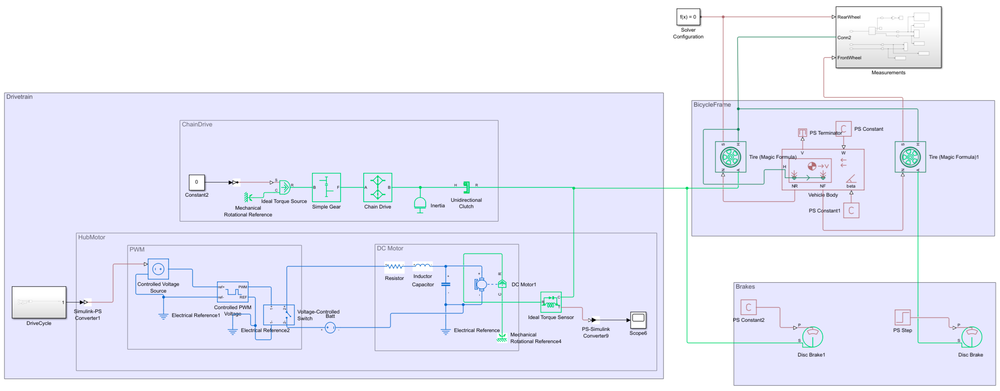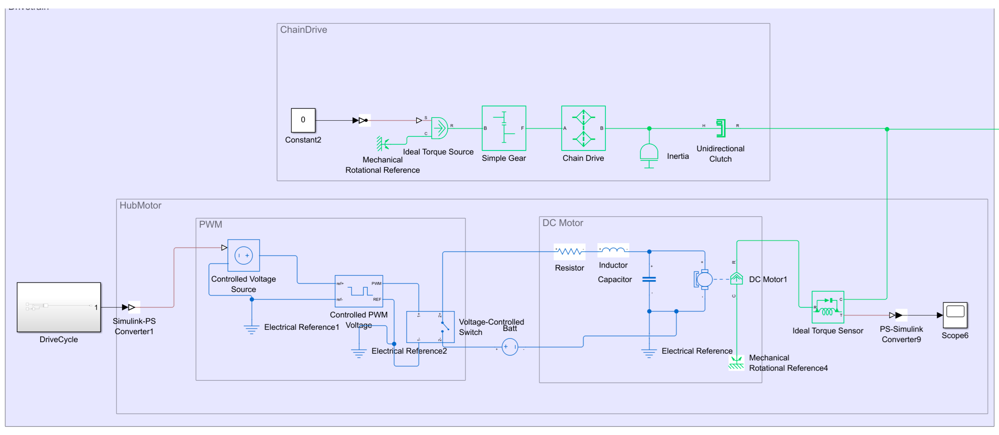 The drivetrain consists of a chain drive that transfers the human pedal force through the system and an electric hub motor that represents the electrical system. A representation of the models is shown in Figure 5.
