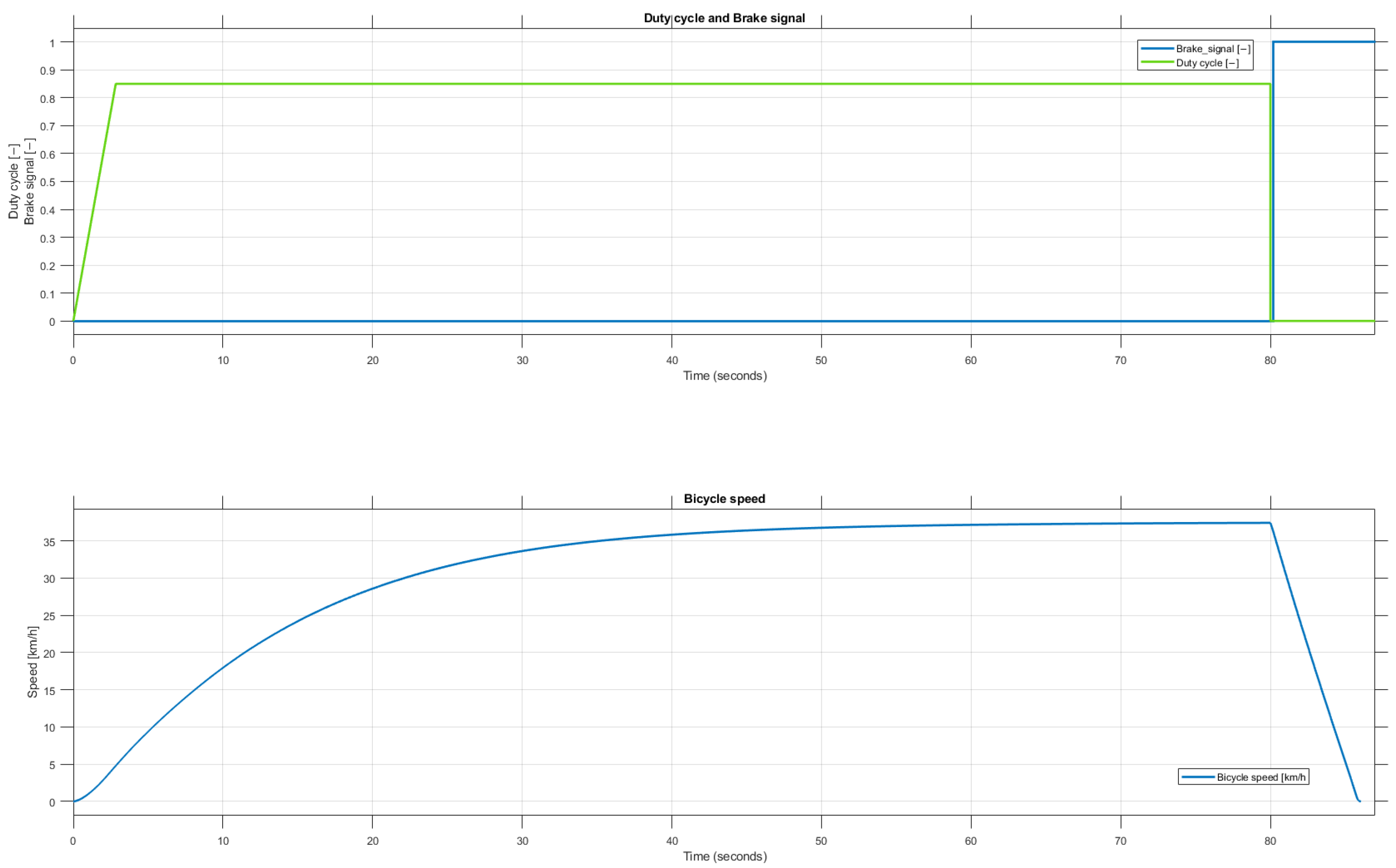 Figure 6. Drive cycle with model response on dry tarmac. The top plots show PWM control and braking inputs, while the lower plot presents the resulting bicycle speed profile. This scenario is used to evaluate braking dynamics under optimal road conditions.