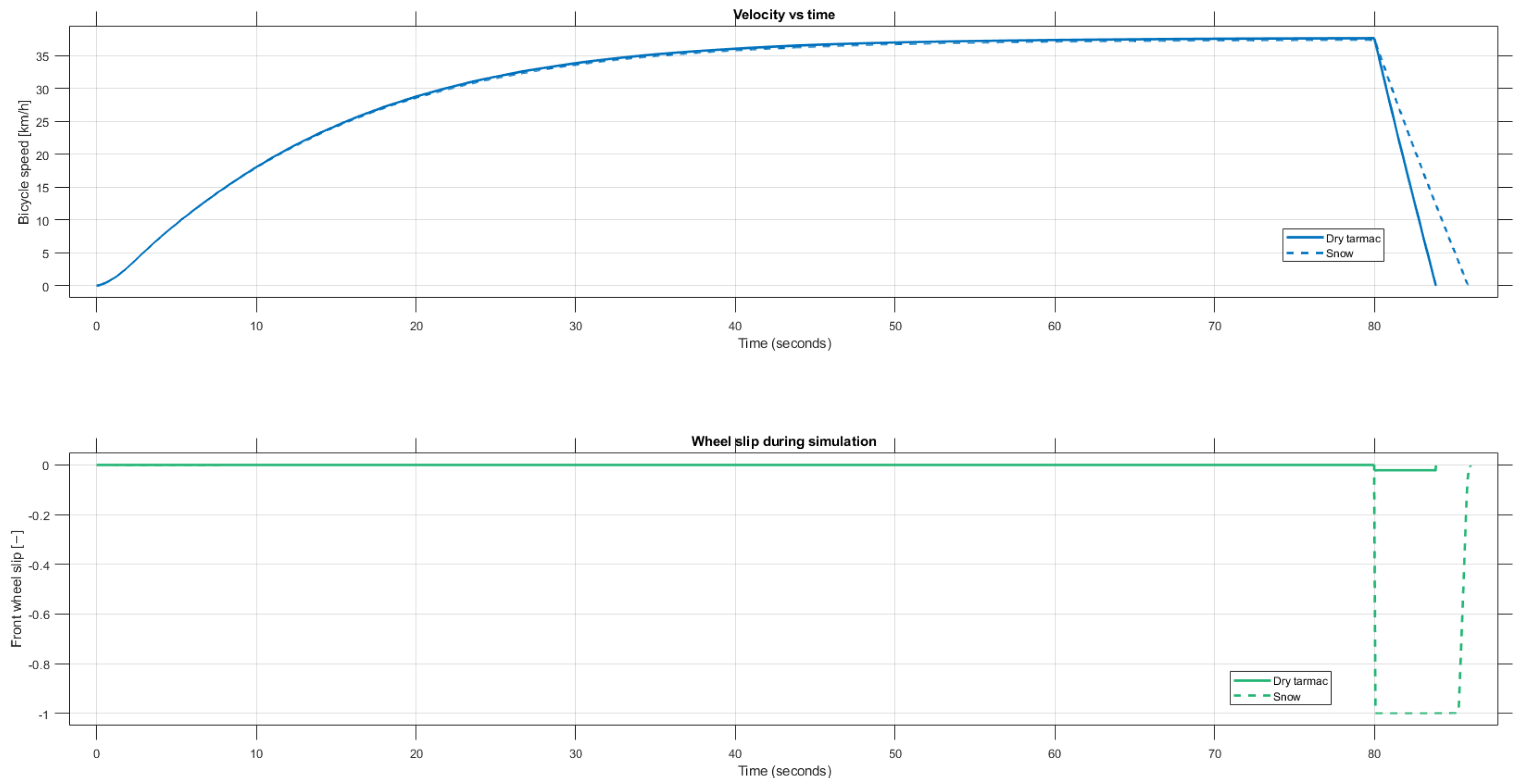 Figure 7 shows that in the acceleration phase, for both road conditions the e-bike is capable of accelerating with a comparable gradient; however, when the braking maneuver starts at 80 s, the simulations show a significant difference. For dry tarmac, the bicycle can stop with small wheel slip values, without locking the wheels. However, for the snowy road, the wheel slip is −1, meaning that the front wheel is locked, and it is not rolling, but slipping over the road surface. From the vehicle speed we also see major differences, the speed decrease is less significant for the snowy road conditions [13].