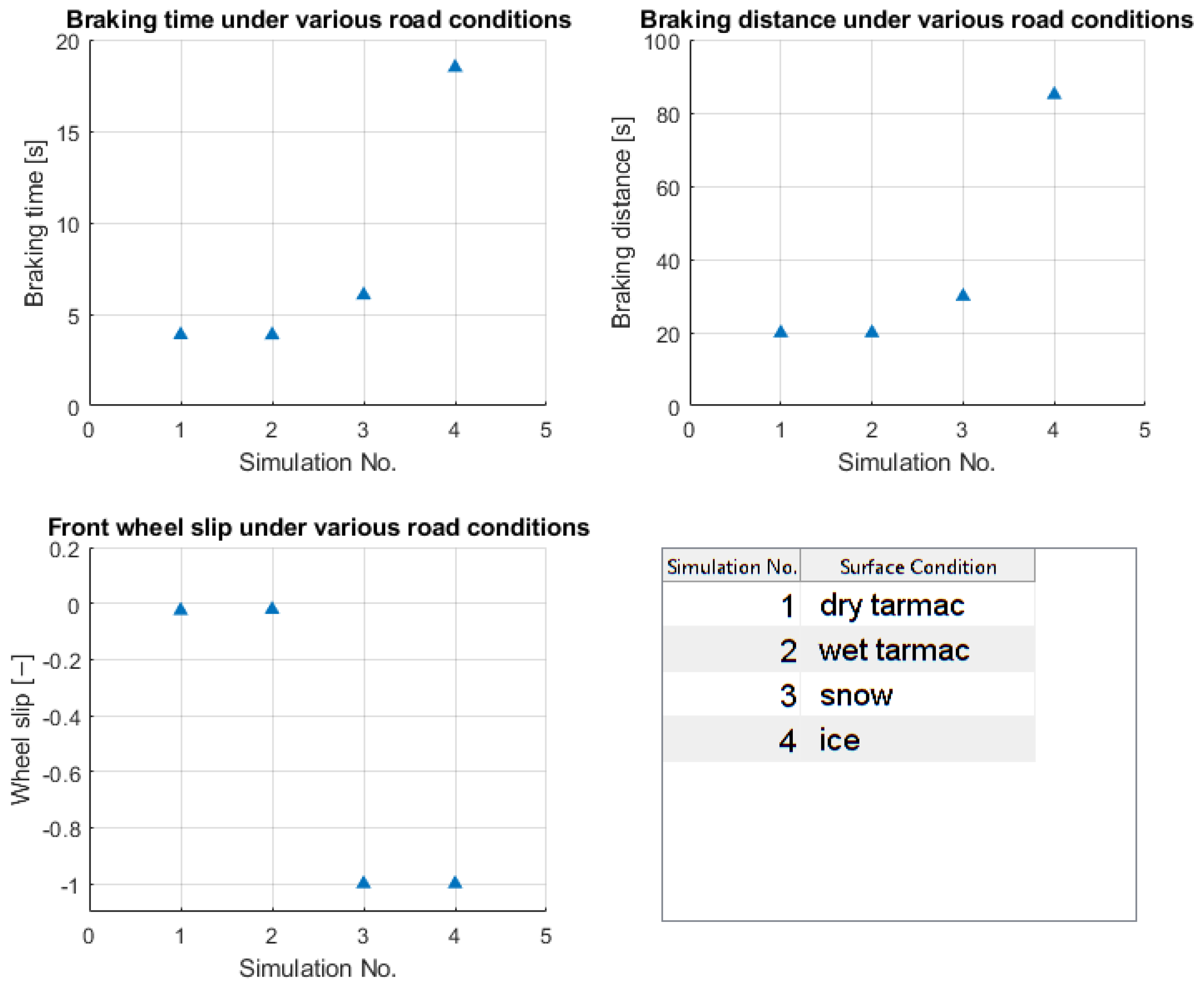 The three plots of Figure 8 show the relevant parameters, and we can see that for dry and wet tarmac, the wheel slip is 0 throughout the simulation, and also there are no differences in the braking time and braking distances. However, for snowy and icy road conditions, in both cases it comes to a wheel lockup, and the braking time and braking distance increase. For the snowy road condition, the braking distance increases by 50%, and for the icy road condition, the increase is over 400%, which is significant [14].