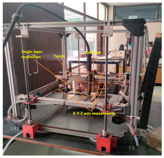 The current study implemented a wire-arc additive manufacturing (WAAM) process based on gas metal arc welding (GMAW) to deposit beads using 0.2 mm diameter metallic wire of 80B2 grade onto mild steel substrate plates. Mild steel was chosen as the substrate material due to its widespread industrial application, affordability, and compatibility with the 80B2 low-alloy steel filler wire. The chemical composition of the filler wire is provided in Table 1. The experimental setup for this study included several key components essential for the WAAM process as shown in Figure 1. These included a GMAW torch, wire feeder, controller, shielding gas system, and a mixing chamber. The machine used in the study had a build capacity of 220 × 220 × 500 mm, providing ample space for fabricating test specimens. The GMAW torch, with its mobility in the X, Y, and Z directions, enabled precise deposition of material onto the substrate. Control over the deposition process was facilitated by a controller capable of receiving input in the form of G-code through a computer interface. The metallic wire feedstock was melted using a Colton iFLEX 350 (Colton Weldtek Private Limited, Bengaluru, India) power sources to initiate the deposition process.