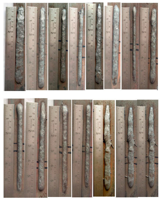 A total of fifteen experimental trials were performed, varying the input parameters at three levels in accordance with the BBD matrix, as shown in Figure 2. In each trial, the bead geometries, bead height (BH) and bead width (BW), were carefully measured to assess bead morphology. The resulting deposits were also visually inspected to ensure the absence of common defects such as lack of fusion or porosity. These pilot experiments helped establish a feasible parameter range for the subsequent phases of the study.