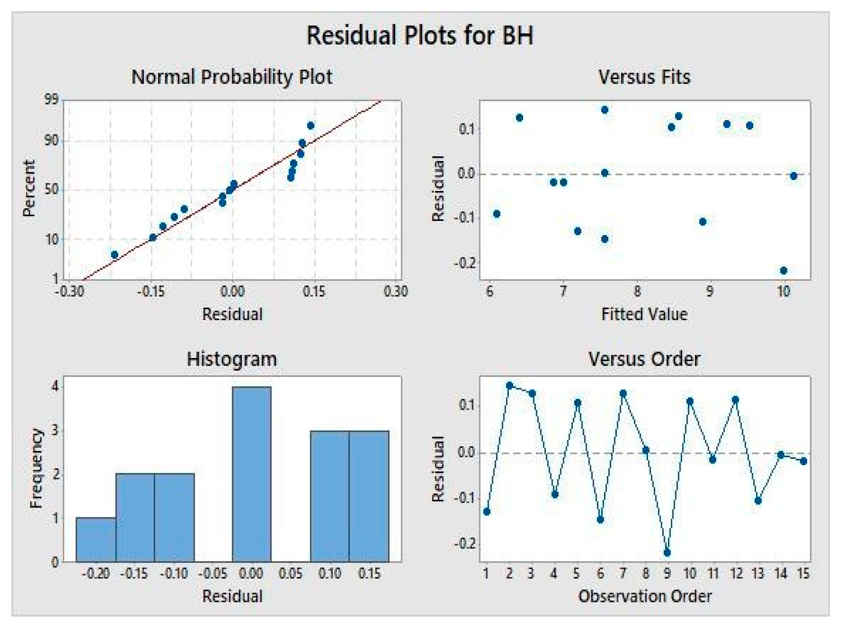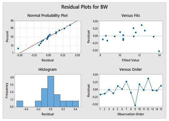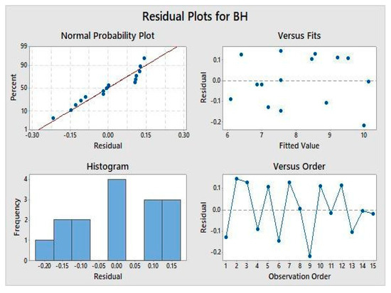 The residual plots were examined to confirm the reliability of the ANOVA results [45]. ANOVA is considered an effective tool for model evaluation when these underlying assumptions are met, and residual analysis plays a critical role in this verification process [46]. Four types of residual analyses were conducted for the bead height (BH) and bead width (BW) responses, as shown in Figure 3 and Figure 4, respectively. The normal probability plots indicate that the residuals closely follow a straight line, suggesting that the residuals are normally distributed and the models are appropriate [47]. The “versus fits” plots show that residuals are randomly scattered around zero, confirming the absence of nonlinearity and constant variance issues. The histogram plots display a bell-shaped distribution, supporting the normality of the residuals and the validity of the ANOVA results. Additionally, the “versus order” plots exhibit no discernible pattern, further reinforcing the reliability of the ANOVA and enhancing confidence in the model’s predictive capability. The favorable outcomes of all four residual plots confirm the adequacy and reliability of the regression equations derived from the ANOVA analysis [48]. This validation also demonstrates that the regression models can be effectively used to predict outcomes across a range of input parameter values. Similar findings has been reported by Magabe et al. [49] and Chaudhari et al. [46] for the verification of ANOVA findings by using residual plots.