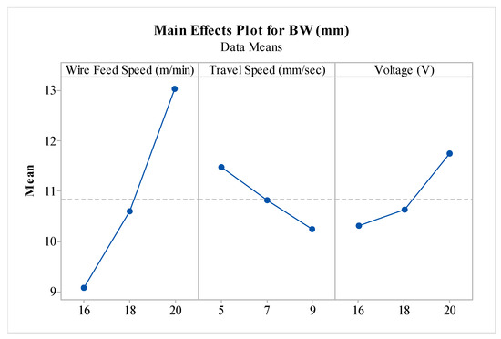Figure 5 depicts the impact of design factors on the BW response. The BW of the deposition was found to be significantly impacted by an increase in WFS, which was explained by the higher deposition rate brought on by the metallic wire’s increased speed [50]. As a result, there was a rise in WFS and a reduction in BW. On the other hand, the BW vs. TS plot showed a positive connection, meaning that a rise in TS caused the BW to decrease since a faster torch speed resulted in fewer molten metal droplets being deposited [51,52]. It was also found that an increase in voltage had a detrimental effect on BW because it caused the arc to spread, which led to the deposition of bigger molten metal droplets and a wider bead overall [53,54]. The obtained trends for BW response with changes in input factors were in agreement with results reported by Vora et al. [55] and Kumar et al. [56]. The desired WAAM variable values for attaining minimal bead width were 16 V for V, 9 mm/s for TS, and 16 mm/min for WFS, based on the main effect plots.